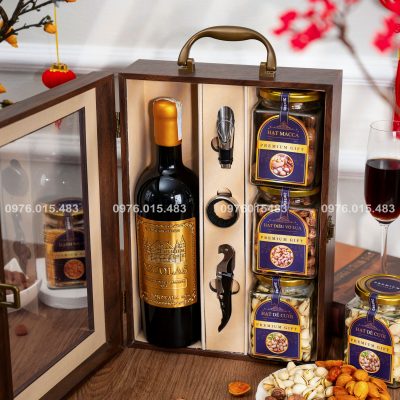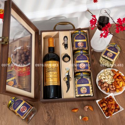 Rượu Vang Nicolas: Chai rượu vang Nicolas nhập khẩu là nguồn cảm hứng chính cho sự tinh tế và đẳng cấp của hộp quà. Với hương thơm phức tạp và vị ngon lôi cuốn, rượu vang này làm nổi bật giá trị và ý nghĩa của món quà.