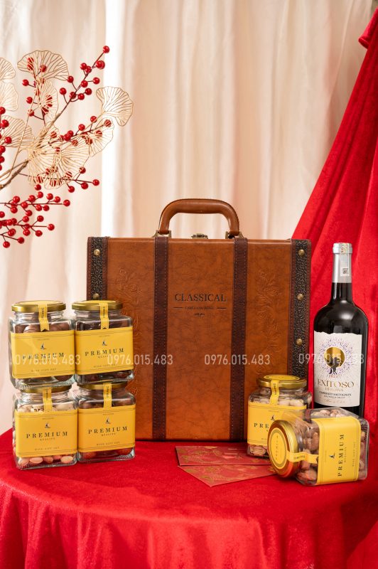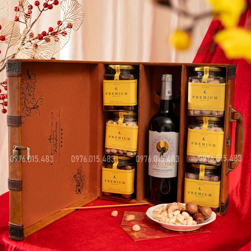 Bên trong là sự kết hợp hoàn hảo giữa rượu vang nhập khẩu Chile Exitoso và 6 hũ hạt dinh dưỡng cao cấp – tượng trưng cho sức khỏe, tài lộc và sung túc.