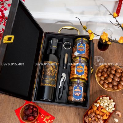 Bên trong là chai vang Chile và ba hũ hạt nhập khẩu được sắp xếp chỉn chu, tạo nên sự cân đối hoàn hảo giữa mỹ thuật và giá trị thực.