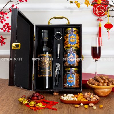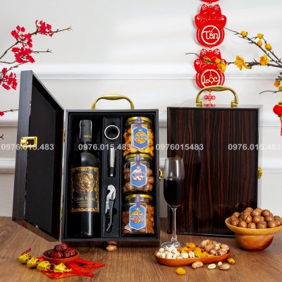 Bên trong là chai vang Chile và ba hũ hạt nhập khẩu được sắp xếp chỉn chu, tạo nên sự cân đối hoàn hảo giữa mỹ thuật và giá trị thực.